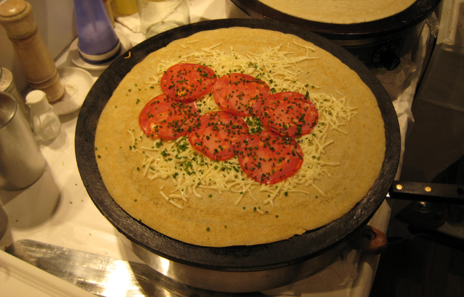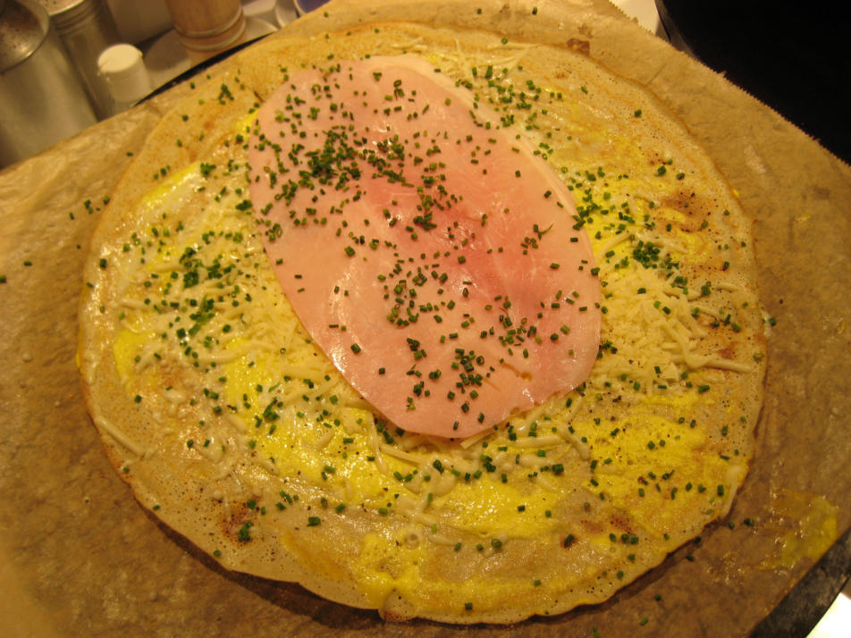mit Ei, geriebenem Emmentaler, gekochtem Schinken, Pfeffer und Schnittlauch