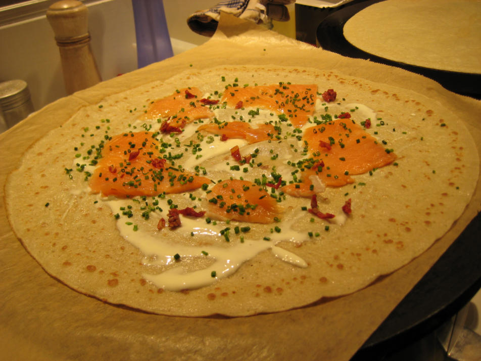 mit Creme Fraiche, Lachs, getrockneten Tomaten und Schnittlauch